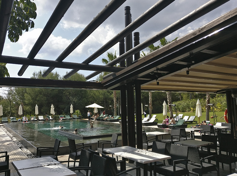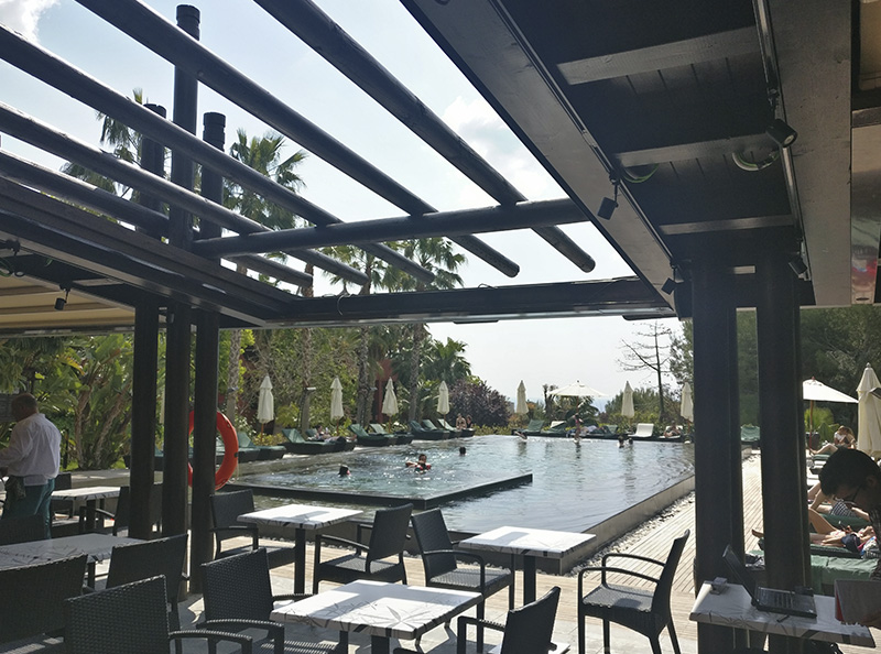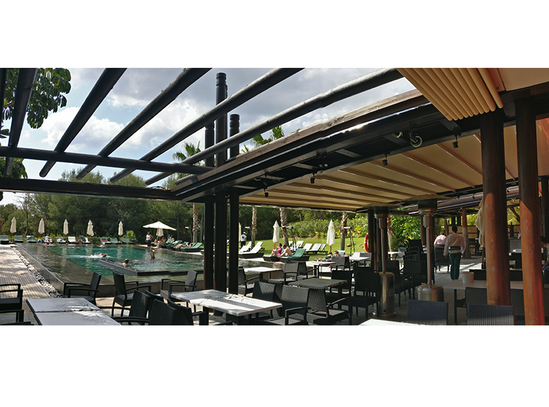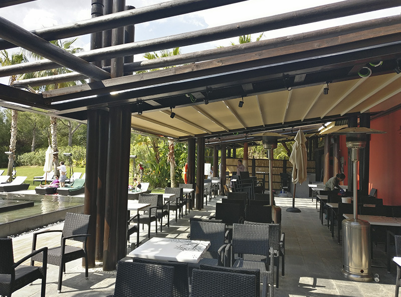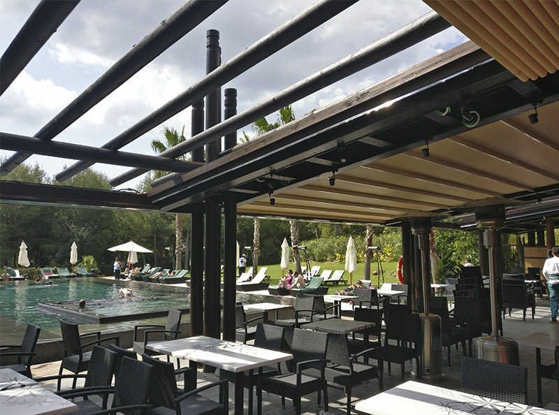 Terraza de 220 m2 en la costa occidental española construida llave en mano por Mejor Afuera para el Grupo Barceló. Acondicionada térmicamente para verano (ventiladores y nebulización), permite su uso continuado como restaurante y celebración de eventos la mayor parte del año.