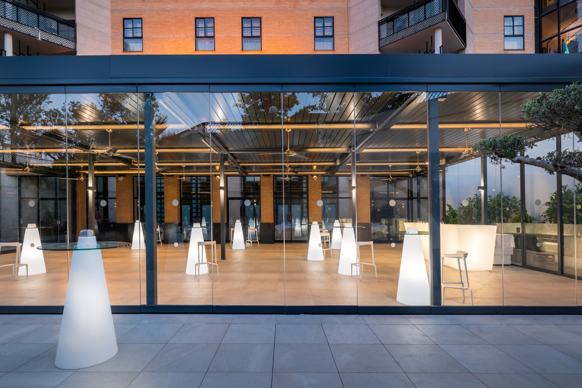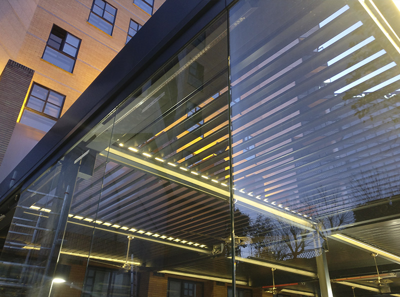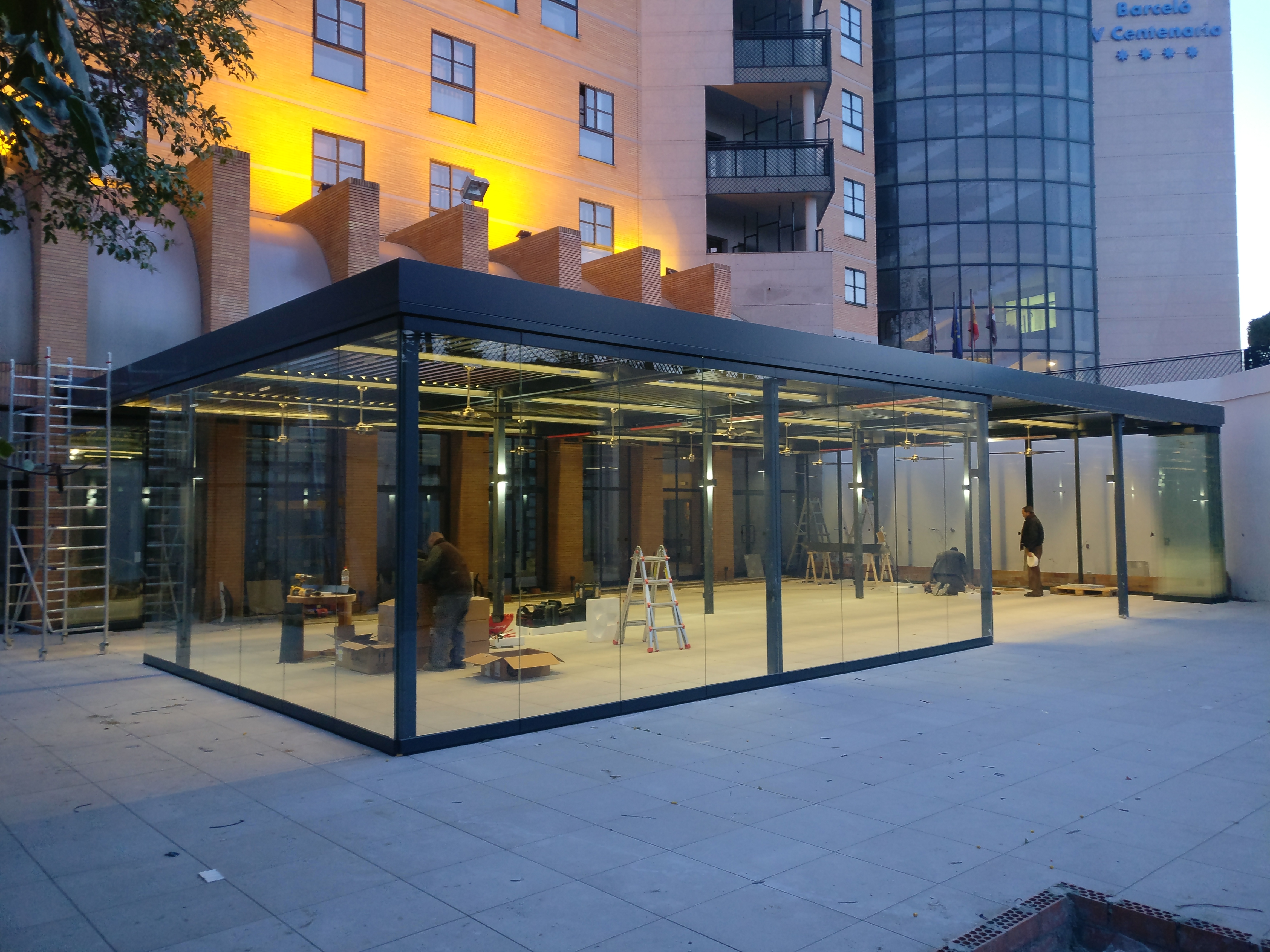 Estructura en acero y cubierta de lamas de aluminio orientables motorizadas. Fachadas exteriores en cortina de cristal, complementada con marquesina de chapa perforada de acero inoxidable en fachada suroeste. Incorpora ventiladores y paneles calefactores.