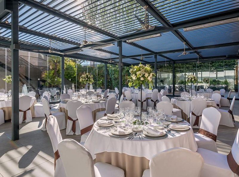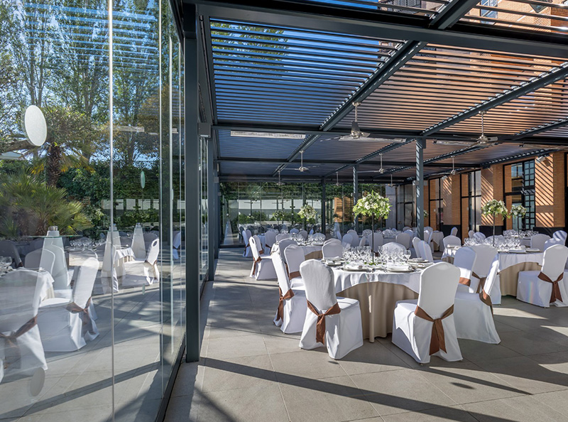 Terraza de 220 m2 en Cáceres construida llave en mano por Ecobuilt Outdoor para el Grupo Barceló. Acondicionada térmicamente para verano (ventiladores), permite su uso continuado como restaurante y celebración de eventos la mayor parte del año.