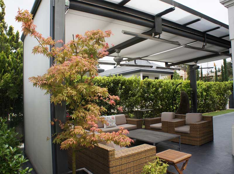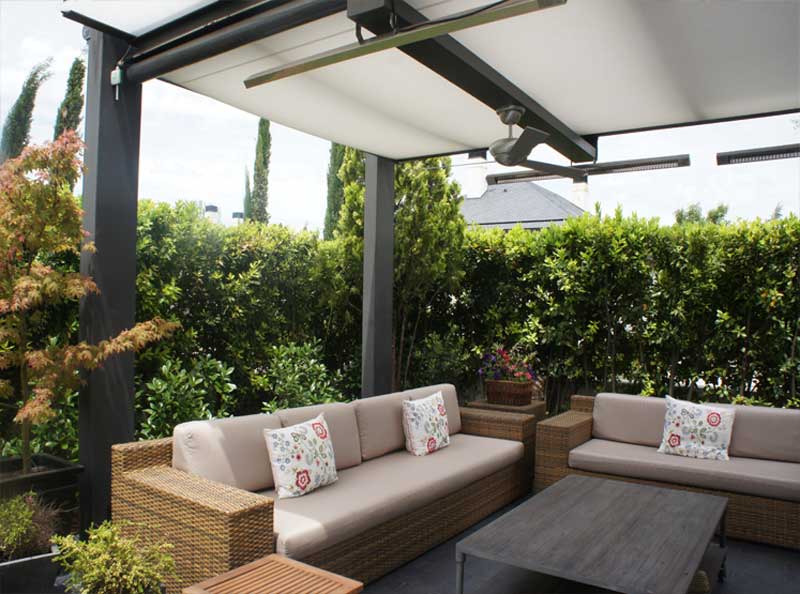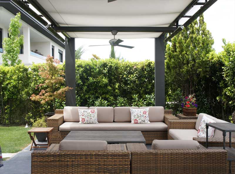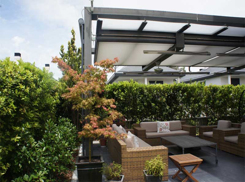 Terraza de 40 m2 en chalet particular en urbanización La Florida de Madrid. Con estructura metálica y cubierta de vidrio translúcido, incorpora elementos de acondicionamiento térmico tanto de verano (ventiladores y nebulización) como de invierno (calentadores infrarrojo y suelo radiante), permitiendo su uso tanto en invierno como en verano.